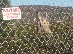 I have my own “roof” from which I can look out on the world and the other animals. They also seem very happy here and I am glad to have escaped the resentful aura of the caged tigers. On the other hand I feel sorry for them that they are still stuck in the old life, that it is illegal to have me but not them without a permit. Neither lion nor tiger is meant to be a pet; we are predators, we are not tame. We are wild!”