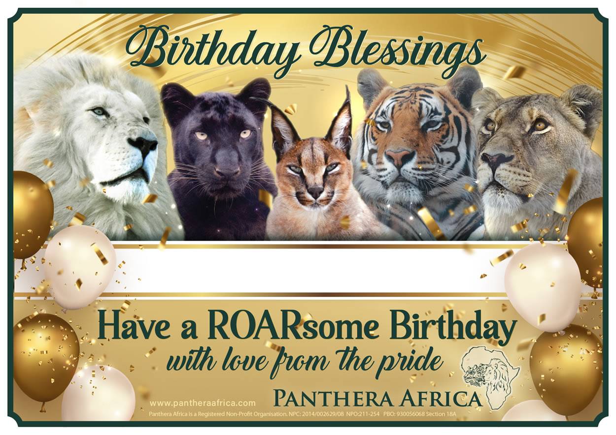 Looking for a birthday gift that will make a difference? Buy this beautiful gift certificate and let us know who you would like to dedicate it to. All the proceeds from this donation goes towards the care of the big cats at Panthera Africa. You can choose the amount you would like to donate.